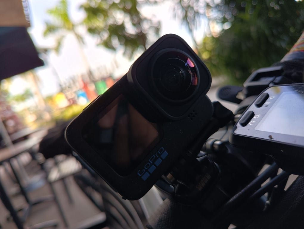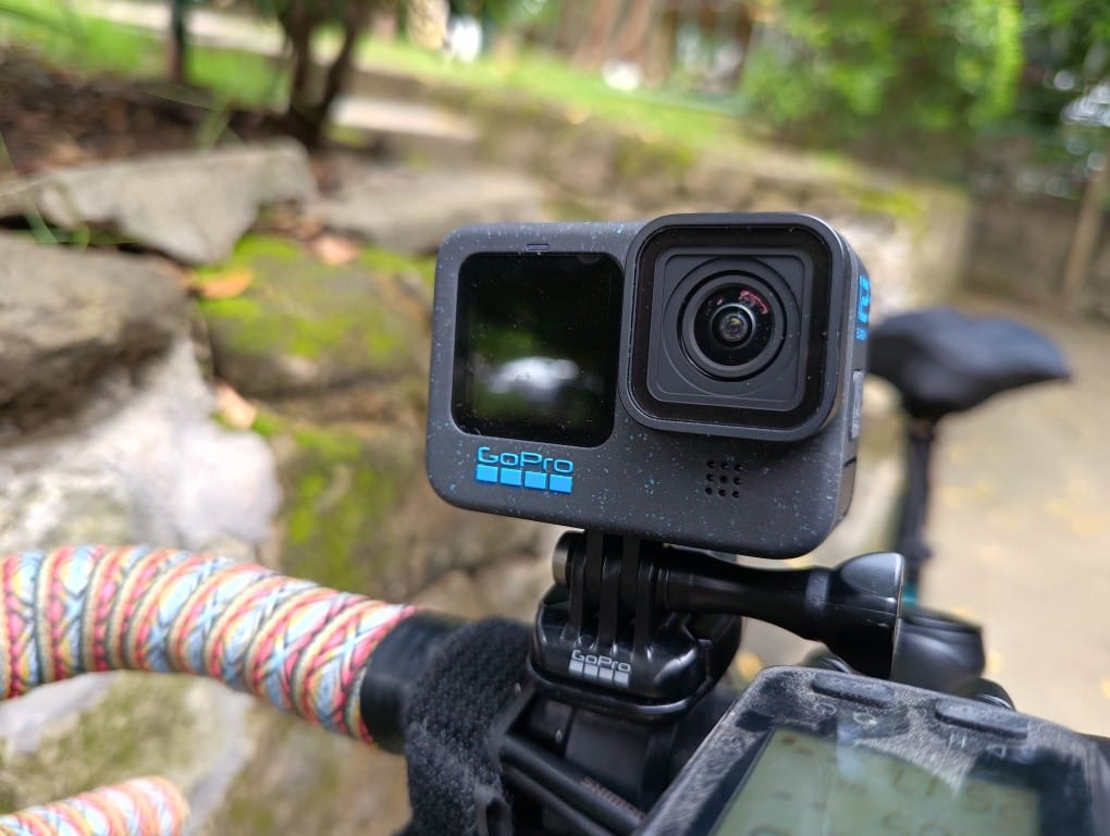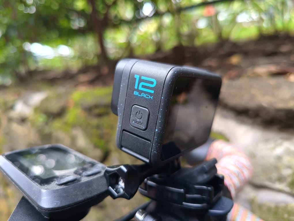 When the HERO12 came out, people had mixed feelings about the spraypaint finish. For me, I grew to love it because it’s a reminder that this device was meant to get dirty. I managed to get the bike mount strapped around the handlebar — it’s going to be tough if you have grip tape so I placed this beside my bike computer. It’s easier for mountain bikes. The GoPro bike mount is good. Don’t look anywhere else. As someone who has tried to attach an action camera to a bike, other mounts just don’t cut it. This one allows you to rotate the GoPro in other directions.