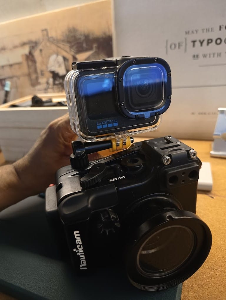 I have yet to take this down into saltwater, but I am aiming for two different configurations with the HERO12 as my main shooting camera and as a secondary camera that can sit above my Sony RX100’s housing via coldshoe mount — they have a couple available in Lazada. This CNC dive rig makes for a good fit as well as it already has ball adapters for fill lights.