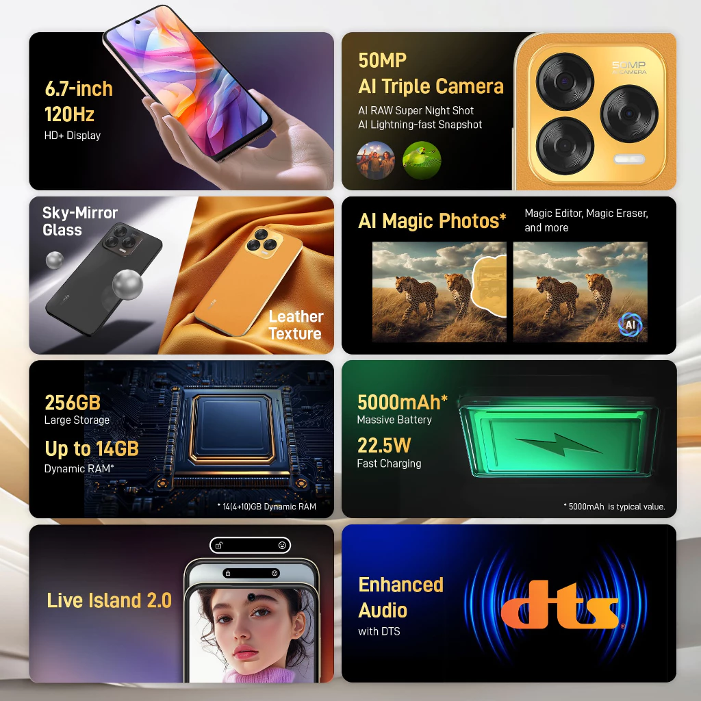 The nubia V70 features a 6.7″ HD+ display with a 120Hz refresh rate, delivering smooth and immersive visuals. It is equipped with a 50MP AI triple-camera system, including RAW Super Night Shot, for capturing vivid and detailed photos even in low light conditions. The device is powered by a robust 6nm octa-core processor with dynamic RAM expansion up to 14GB (4GB + 10GB), allowing seamless multitasking. With 256GB UFS 3.1 flash storage, you’ll enjoy faster data transfer and ample space for all your content. Plus, the 5000mAh battery with 22.5W fast charging ensures extended usage throughout the day. The nubia V70 Design is powered by a Unisoc T606 Octacore 1.6GHz processor.