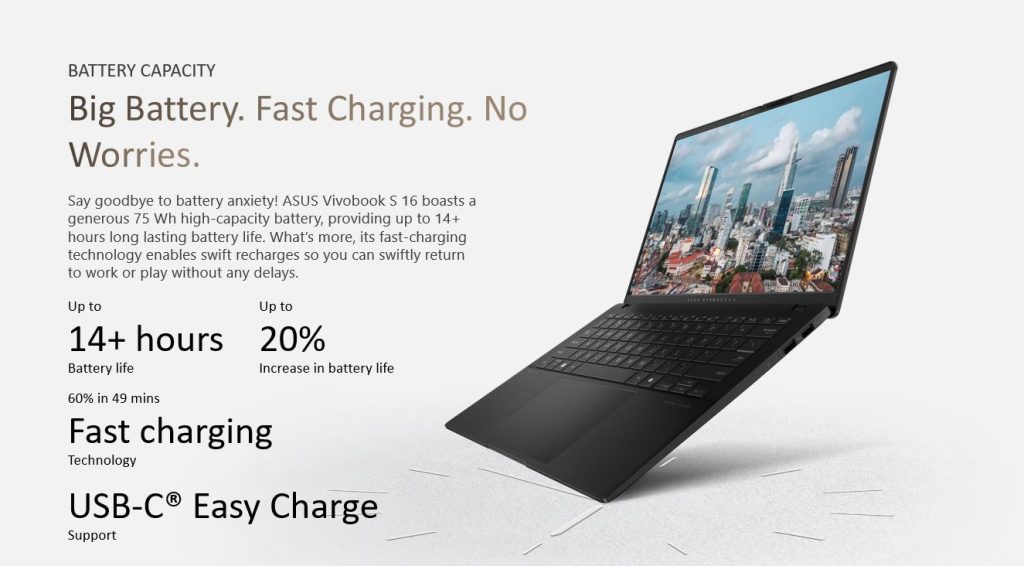 Battery life is another area where the Vivobook S 16 shines. With a 75Wh battery offering up to 17+ hours of use, users can say goodbye to “battery anxiety.” The device also supports fast charging, reaching 60% in just 49 minutes, making it ideal for on-the-go users who need reliable and uninterrupted power.