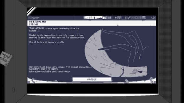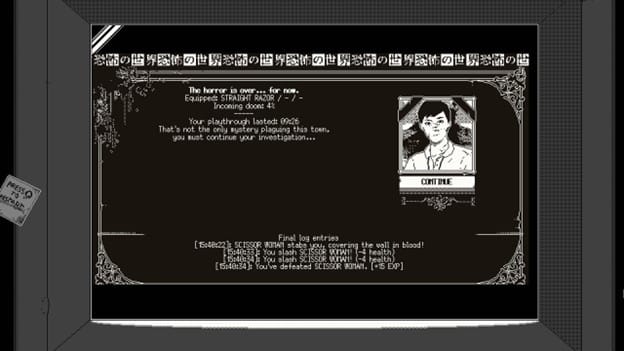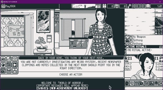But past a certain point, the cognitive dissonance of playing a monochrome-shaded game on a screen capable of vastly superior visuals melts away. The dinky sound effects and tinny synth music become welcome, appropriate accompaniment to your menu-driven terror sojourn. Provided you didn’t flinch and flee after your first forays into World of Horror, it becomes very easy to stick with and replay again and again.