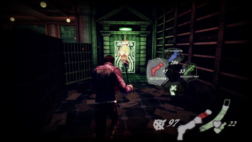 Garcia is accompanied by his sidekick, Johnson, a floating skull who is also his main tool. Among other things, Johnson transforms into a motorcycle, a torch, and into all the guns that Garcia will use in his adventure. He also talks with a delicate English accent and serves as Garcia’s guide to the ways of the underworld. Johnson serves as the game’s tutorial at various points, explaining why goat heads expel darkness when lit, why demons like strawberries (you will need them to open certain guarded doors), and how drinking alcohol heals instead of harms.
