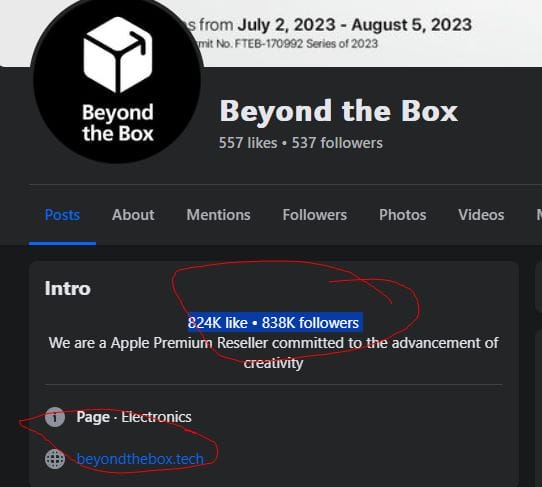 Also, just look at the page description below. For the record, the real Facebook page of Beyond the Box is https://www.facebook.com/beyondthebox.ph. Also, the likes and follow are not links, but typed in the description page.