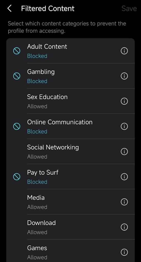 For parental controls I can set blanked browsing restrictions for browsing gambling sites, adult content, social networking, games, and even downloading files.
