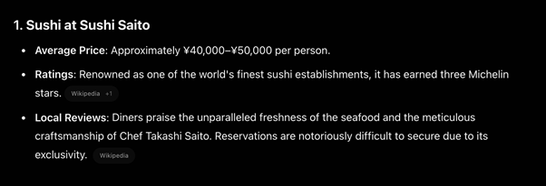 Pro tip: You can also ask it to summarize top-rated spots based on Yelp, TripAdvisor, Google Reviews, or even Airbnb insights. Tailor your search according to your preferences: vegetarian-friendly, Filipino-friendly, budget-conscious, outdoor seating, etc.