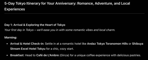 Prompt: “Plan a 5-day itinerary in [City] with walking routes, local experiences, estimated transport costs, and non-touristy food spots. [We are a couple going for our anniversary, so we want a bit of romance and some adventure in between.]”