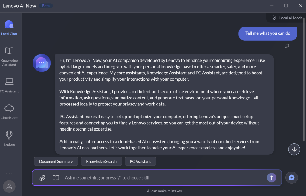 I mentioned that the AI is on-device. Lenovo has an icon labeled ‘Local AI Mode’ that is active whenever you are performing functions that do not require an Internet connection. The functions I mentioned before are a part of this, so it’s like having your own little NotebookLM or ChatGPT that is siloed to your device. This is great for security because it does not connect to the Internet to upload anything. AI Now does have an online mode that is used to search its knowledge database or chat with an AI assistant. I have to reiterate that I appreciate how Lenovo has segregated local and cloud-based chat so you know when you are uploading your data to the cloud.