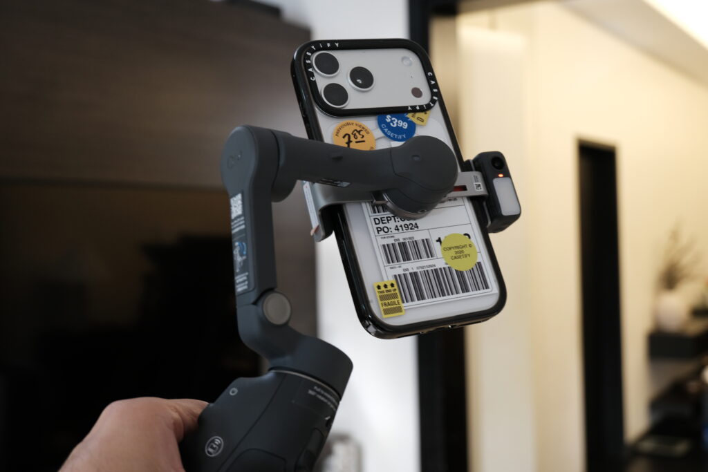 One of the features I truly liked was the built-in AI tracking camera that also comes with a front fill light. It supports hand gestures and is really a good overall icing on top solution if you’re filming alone. Camera tracking also works with support via DockKit, which is a protocol on some accessories to directly support iPhone pairing without the need for additional software. The removable dongle also serves as an external mic audio receiver that you can use to connect other DJI mics.