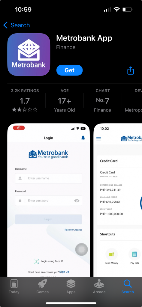 Users can also activate their Metrobank credit card via the app, transfer money from their credit card via PayNow. It also also allows conversion of credit card limit to cash through its Cash2Go service.