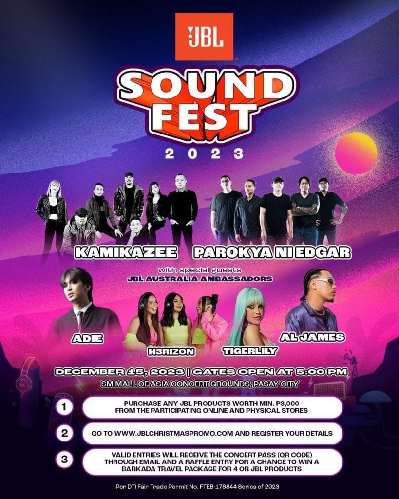 JBL is also throwing a mega music bash called JBL Sound Fest on December 15, 2023! Picture this: OPM legends like Parokya ni Edgar, Kamikazee, Adie and Al James, plus special guest ambassadors from JBL Australia, H3rizon and Tigerlily, all at SM Mall of Asia Concert Grounds!