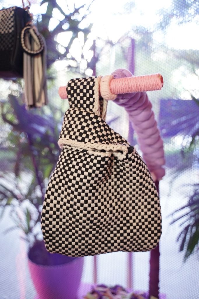 Pam Quiñones designed the Loop Bag which features a woven body made with upcycled fabric in a checkerboard pattern. This is R2R’s first completely hand-stitched bag, with no machine used to make it. It is also a vegan bag, with no other components except the fabric used to make the body.