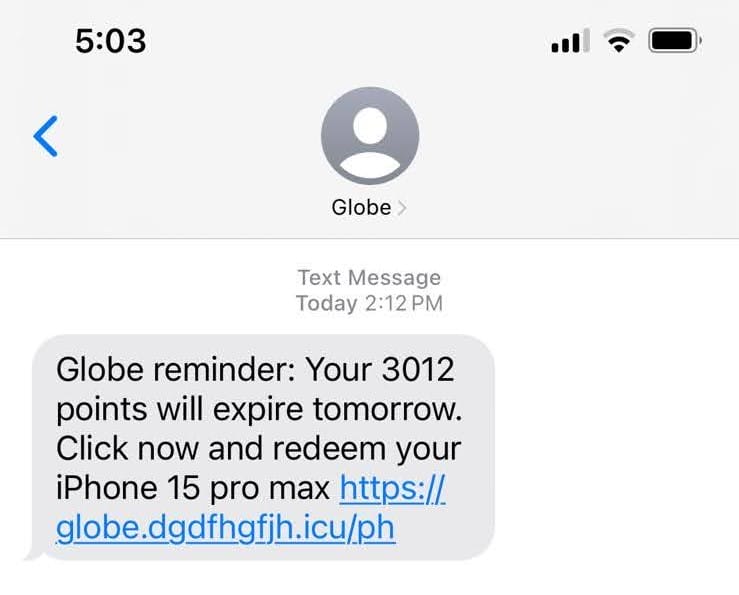 Customers have reported receiving messages illegally sent by scammers via 8080 or sender ID “Globe,” enticing them to click on a fake Globe link to redeem rewards including mobile devices. The modus is done using an illegal equipment called the international mobile subscriber identity (IMSI) catcher, or a fake cell tower or base station. These devices are brought around on foot or inside vehicles to capture mobile users within a limited radius.
