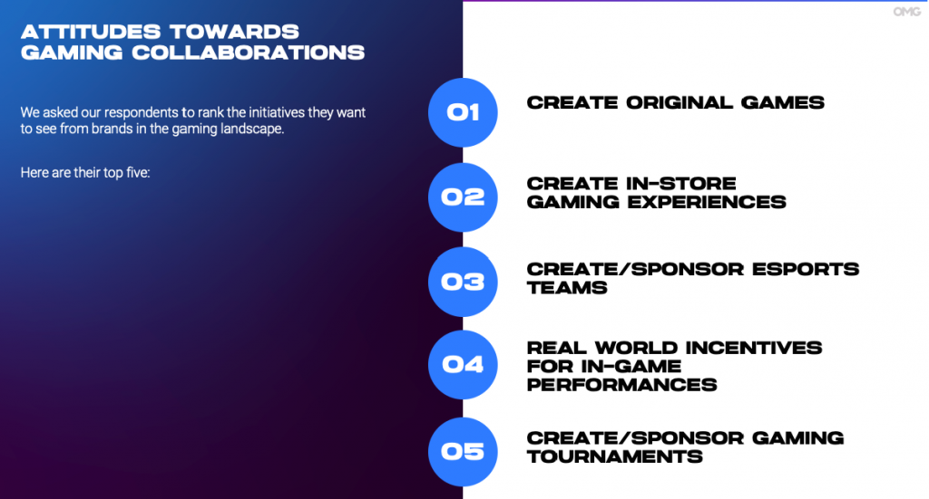 Filipino gamers want gaming collaborations to be a seamless merger between the game and real world. To fulfil their desire to be incentivised and capture Filipinos’ attention, brands can create original games, in-store gaming experiences, and even creating or sponsoring eSports teams. Real world incentives for in-game performances and creating or sponsoring gaming tournaments round off the top five initiatives Filipino gamers wish to see from brands.