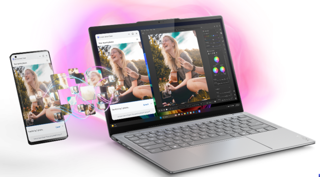 • Yoga Book 9i (14”, 10): A dual-screen OLED convertible laptop acting as a portable creative studio with AI tools like Smart Note for enhanced note-taking and Smart Reader for AI-generated book synopses. Its Air Gestures streamline multitasking across its vibrant displays.