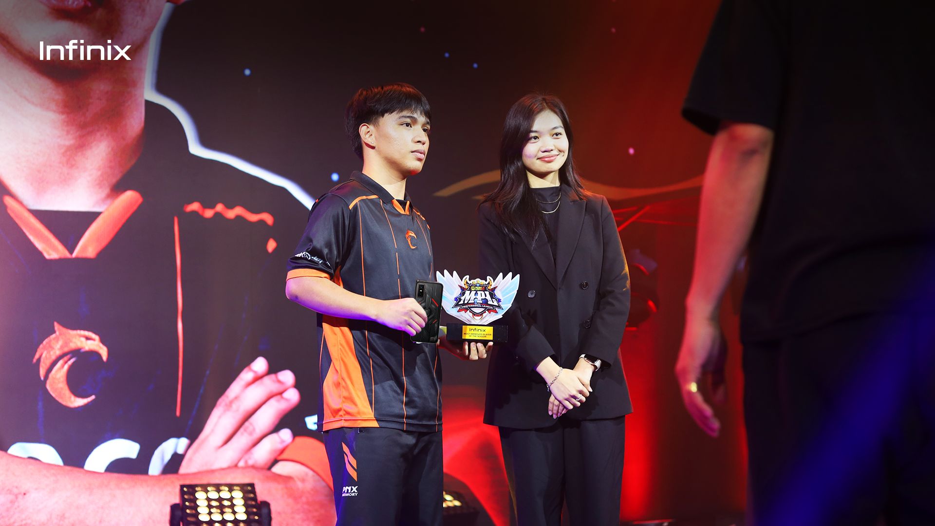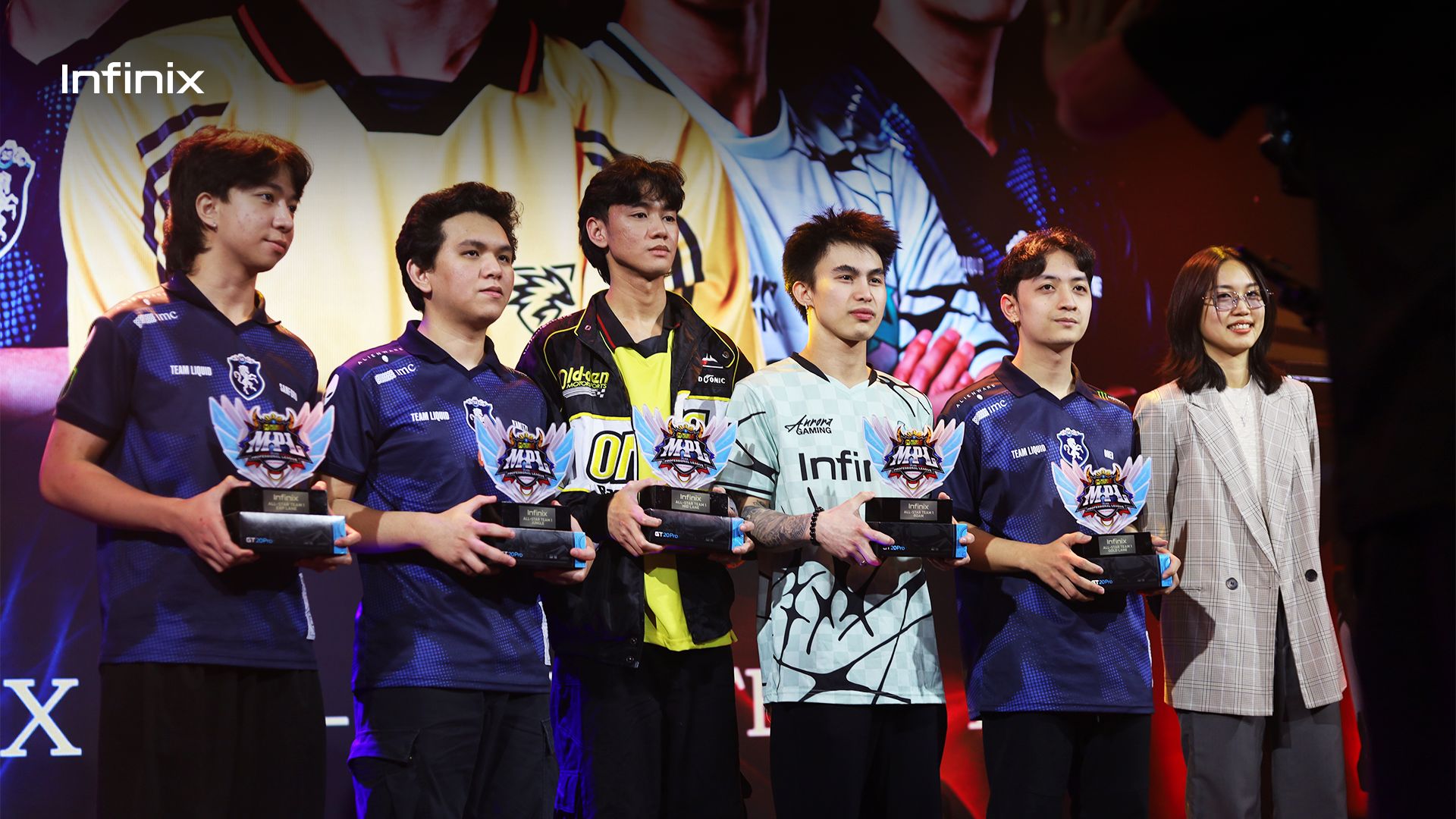 Jelly Buan, Infinix Philippines Marketing Manager, awarded All Star Team 1 with the prestigious MPL Alamat Awards.