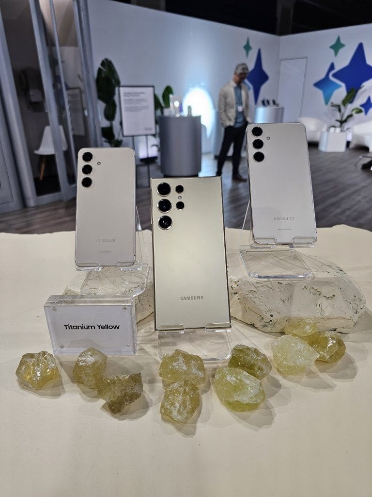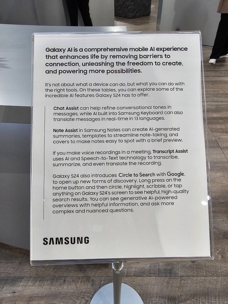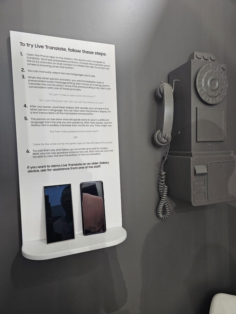 Phones in every color and model were placed strategically around the room and in each corner were demonstration areas showcasing the new AI features of the Galaxy S24.