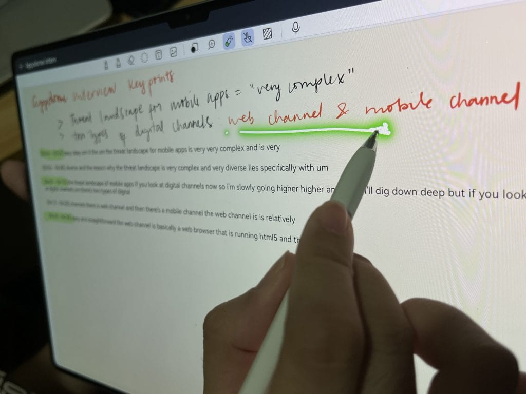 The Notes app in the tablet was my sidekick while I outlined and highlighted key points in a recorded interview. It has useful tools like the laser pointer and the annotate.
