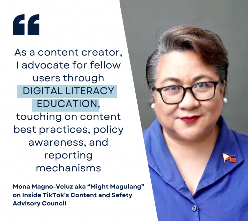 Veluz’ role within TikTok’s Content and Safety Advisory Council involves different aspects.