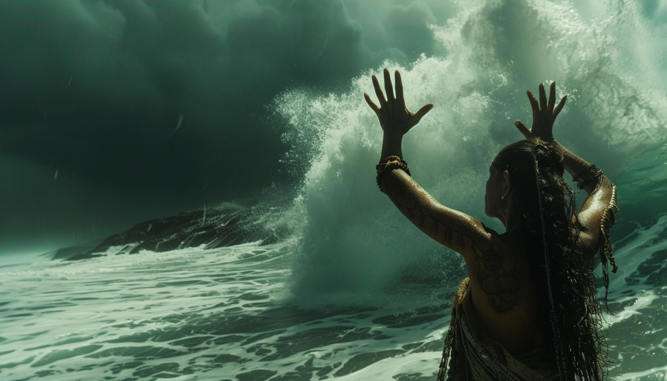 One of the prompts I used was: “Year 1624, a pre-Hispanic priestess in the Philippines, summoning the elements by the sea, her hands raised while we see the waves crashing against a nearby peninsula, in the style of the movie 300—cinematic, dark, dramatic, high definition, realistic.”