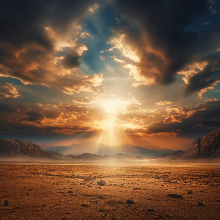 “A realistic photo of the sky in the desert with nimbostratus clouds and the sun peeking through, with sun rays shining out from the clouds. Crisp, clean, and dramatic.”