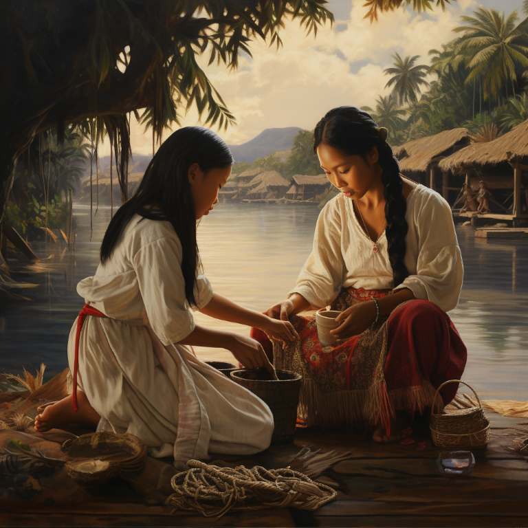 One of my prompts was: “1700s, a young Filipina, about 15 years old, her hair being braided by her sister at a nearby river bank near their house. Warm, glowing, nurturing”.