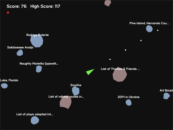 In this version, Wikipedia edits replace the original game’s randomness. Each Wikipedia edit spawns an asteroid labeled with the article’s title—the larger the edit, the bigger the asteroid.