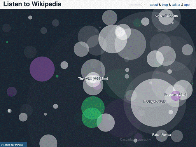 First published in 2013, this website visualizes real-time edits to Wikipedia by circles that appear then slowly fade whenever an article is edited. The larger the change, the bigger the circle. Each edit is also accompanied by either a bell sound or a plucked metallic string with bells indicating net additions and strings net deletions. And when a new user registers an account, a grand sound swells in.