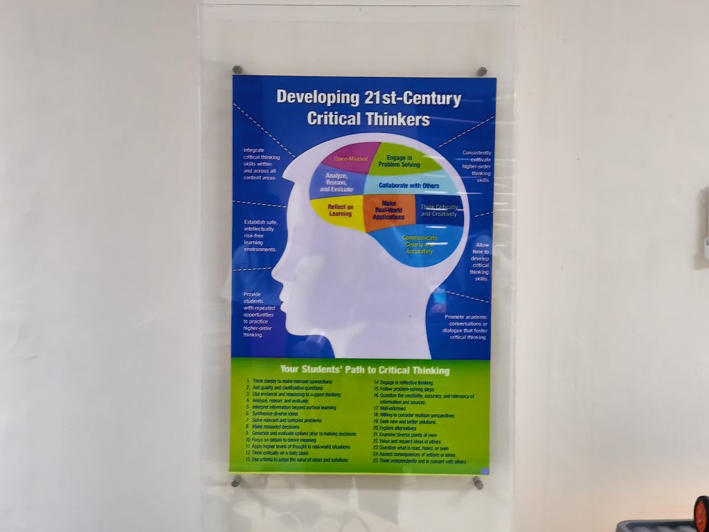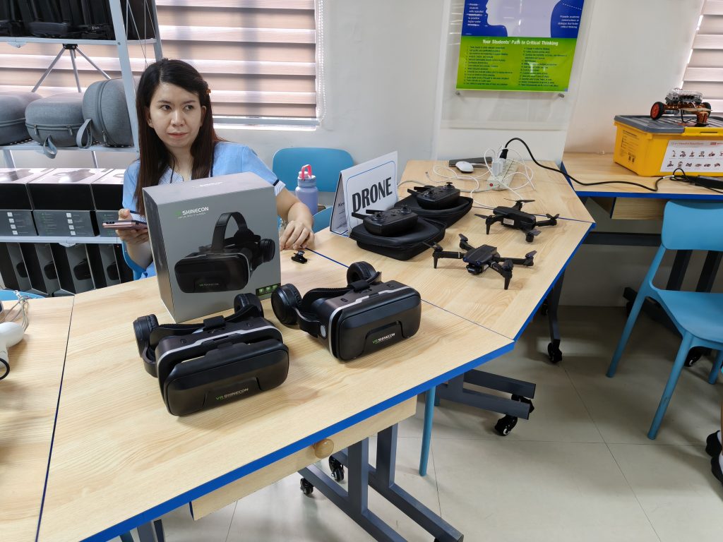 Inside, the setup departs from the traditional rows of chairs and blackboards. Instead, the space features robotics kits, drones, virtual reality headsets, and laptops.