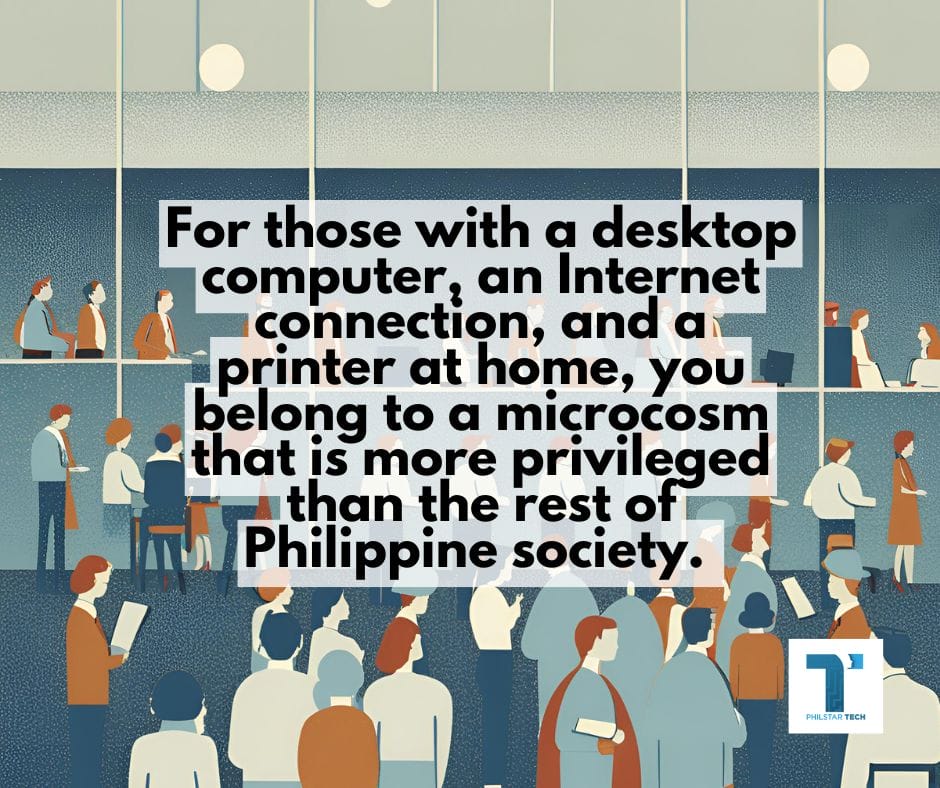 For those with a desktop computer, an Internet connection, and a printer at home, you belong to a microcosm that is more privileged than the rest of Philippine society. In the past, being able to read and write were the great equalizers. Today, having an Internet connection and access to information makes life a thousand times more convenient. And I guess this is what it means to educate people in these digital times. After almost three decades of the Internet in the Philippines, it still all boils down to who has access versus who does not.