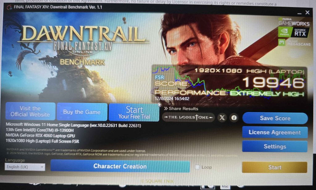 As for benchmarking, I play a lot (or used to anyway) of Final Fantasy XIV and they have this benchmarking tool that they release every new expansion. I ran the benchmark on the Infinix GT Book and this is the result.