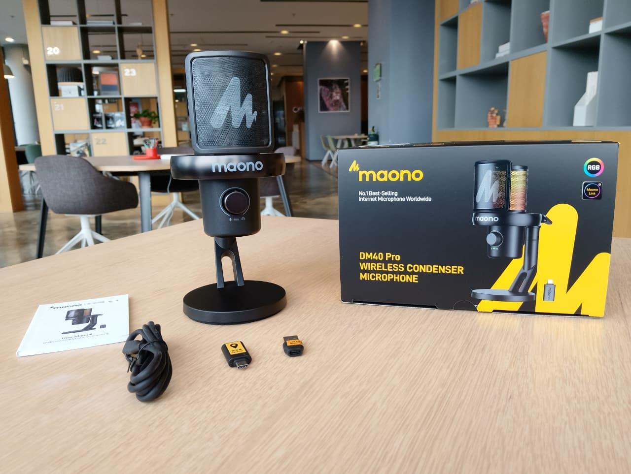 Inside the box were the following: the DM40 Pro Wireless Condenser Microphone itself, a Type-C Bluetooth adapter, a Type-C male-to-male charging cable, and a USB-to-Type-C converter so you could attach the adapter to an empty USB port instead of a Type-C port. Instructions were also included on operating the microphone, which was very plug-and-play, with the accompanying Maono Link program serving as the main controller for PC use.