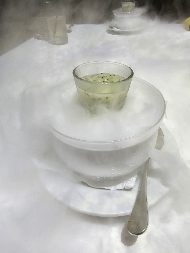 Basically, your table and everything on it, like your plates and utensils, gets scanned and then images are projected onto the table. Add in some music, props, an exquisite menu and the result is an interactive gastronomic experience you won’t forget.