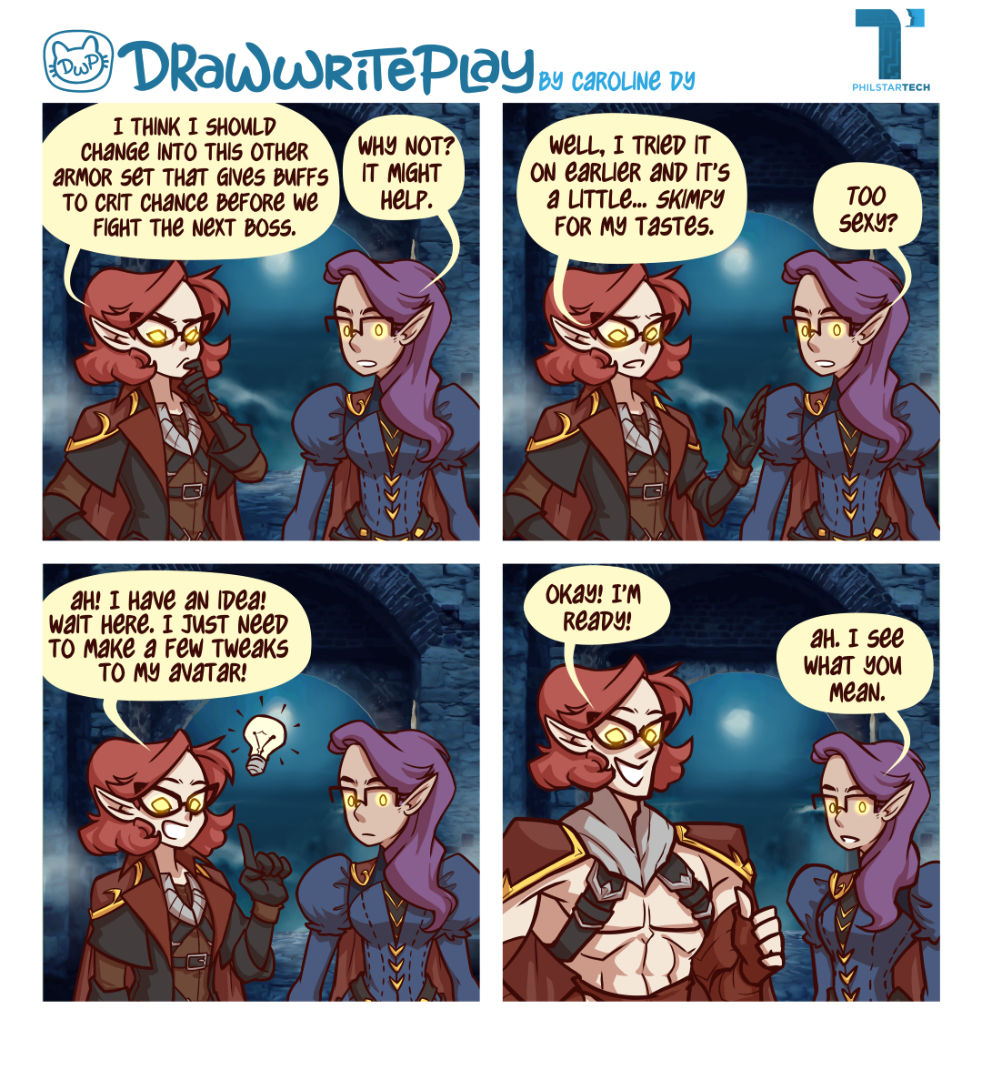 Editor’s Note: I was chatting with Caroline Dy about her pitch for June’s comic strip. She’s been playing a lot of V Rising lately (a really good game, especially with a huge group!) and this strip is heavily inspired by the character creator feature, allowing you to alter all cosmetic features by looking into a mirror (which is funny because … Vampire!). I told her that this strip is timely since June is pride month. We had no idea it would fit so well. In video games, I guess gender is truly fluid.