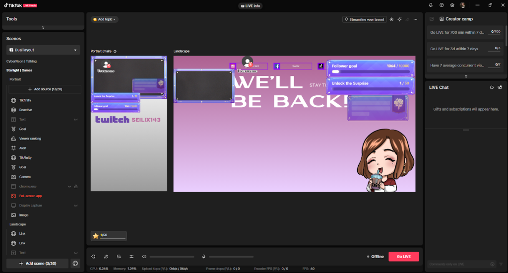 Currently, I stream on both TikTok and Twitch since I use different streaming software for each platform. If your PC can handle it, I highly recommend this setup, as it really does help build your community even more by offering different ways for viewers to chat and interact with you!